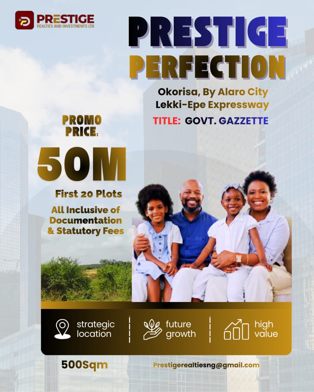 Prestige Perfection, strategically located in Okorisa, by Alaro City along the Lekki–Epe Expressway; One of the most sought-after and fastest-developing real estate corridors in Lagos.