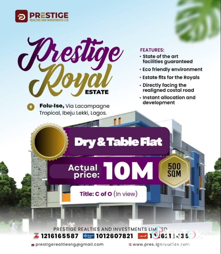 PRESTIGE ROYAL Okun FOLU, Via Lacampaigne Tropicana Resort, Ibeju Lekki, Lagos. DRY & TABLE FLAT